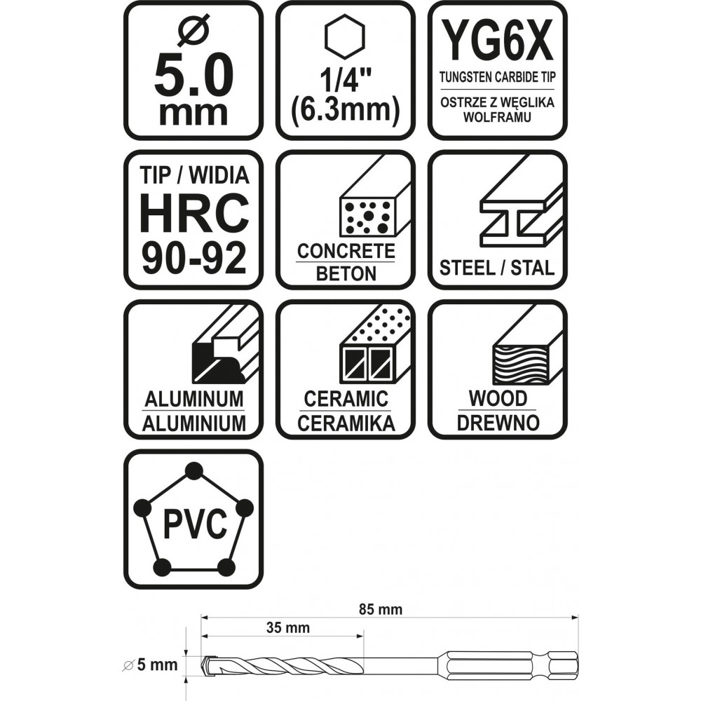 Свердло універсальне STHOR з шестигранним хвостовиком 1/4" 5 х 85/35 мм YG6X