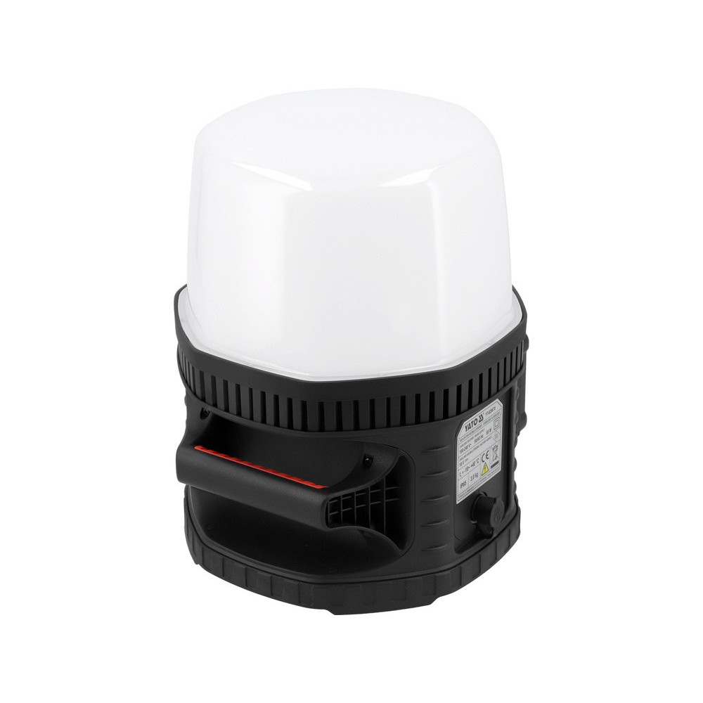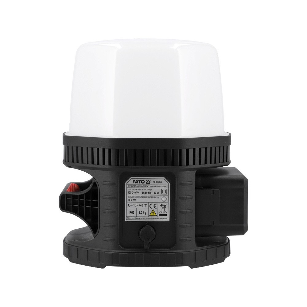Світильник працює від мережі або від платформних батарейок YATO 18V. На відміну від багатьох інших моделей, які втрачають живлення в мережевому режимі, лампа YT-829670 забезпечує однакову інтенсивність світла (люмен) незалежно від джерела живлення. Крім того, завдяки перехідникам можливе живлення акумуляторів інших типів.