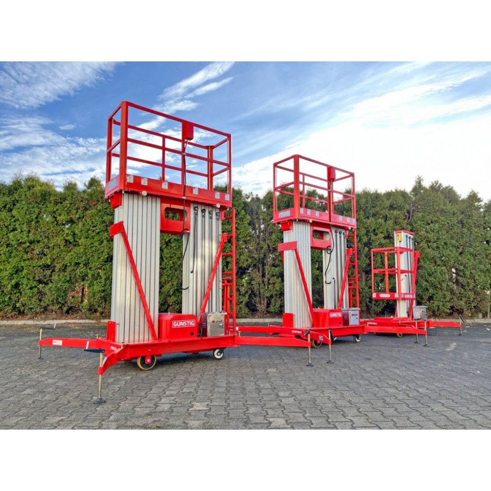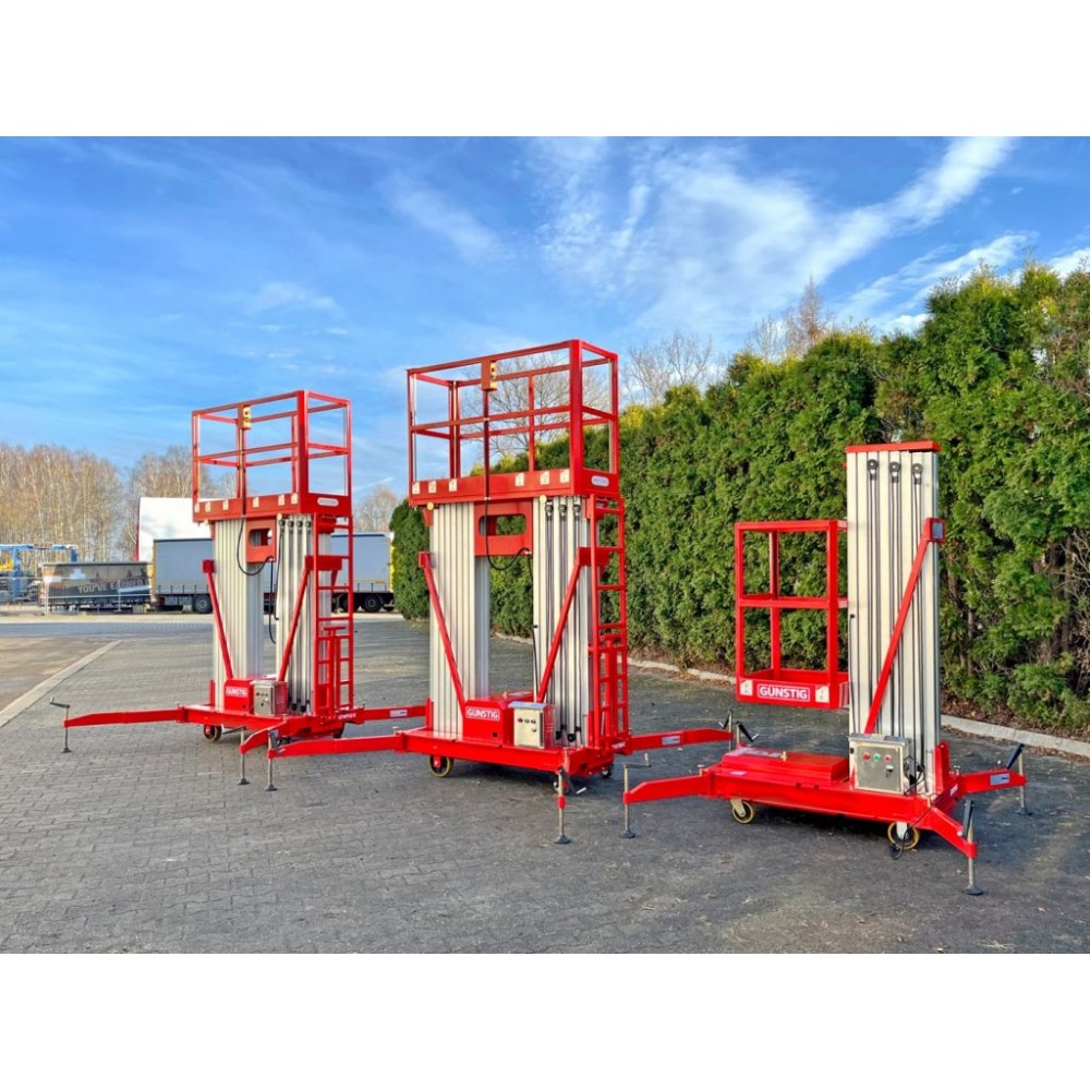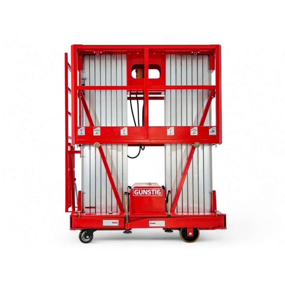 Телескопічний щогловий підйомник (двомісний) Günstig GTWY10-2 з 2 телескопічними щоглами та електродвигуном потужністю 1,5 кВт призначений для робіт на висоті в закритих приміщеннях і на будівельних майданчиках з рівним покриттям і доступом до електромережі. Платформа розміром 1500x600 мм витримує навантаження до 250 кг, що дозволяє одночасну роботу 2 операторів. Для стабілізації платформи при підйомі використовується система розкладних опор (аутригери). Висота платформи - 10 м, робоча висота - 11,7 м. Живлення від напруги 230 В.