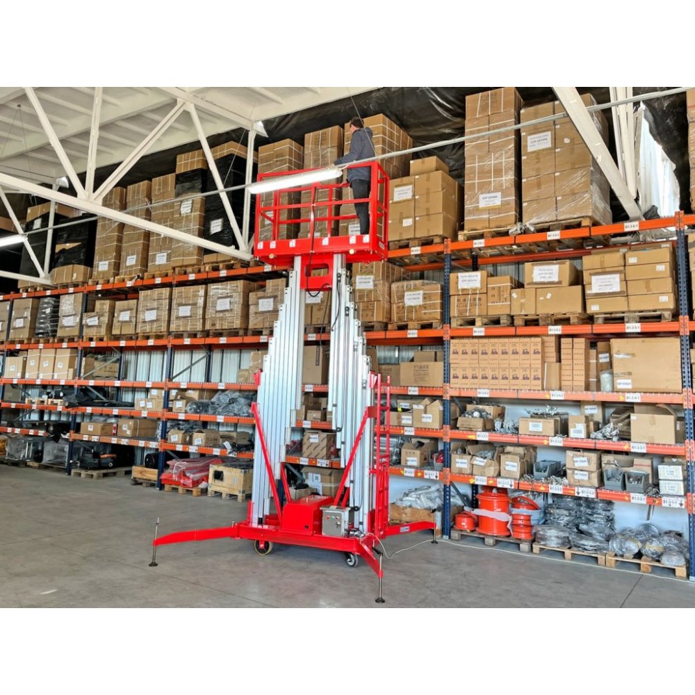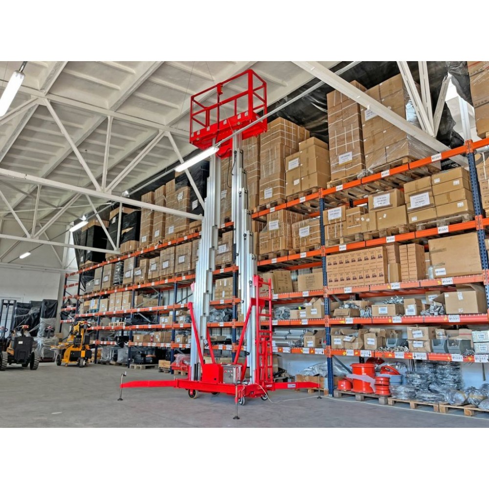 Компактний розмір (ширина 900 мм) і поворотні колеса дозволяють легко переміщатися у вузьких проходах і через двері. Для зручності є 2 панелі керування - знизу і на платформі. Для безпечності використання цей підйомник для внутрішніх робіт оснащений кнопками аварійної зупинки на обох панелях, системою автоматичного опускання платформи при збої живлення, а також захистом від перевантаження і короткого замикання.