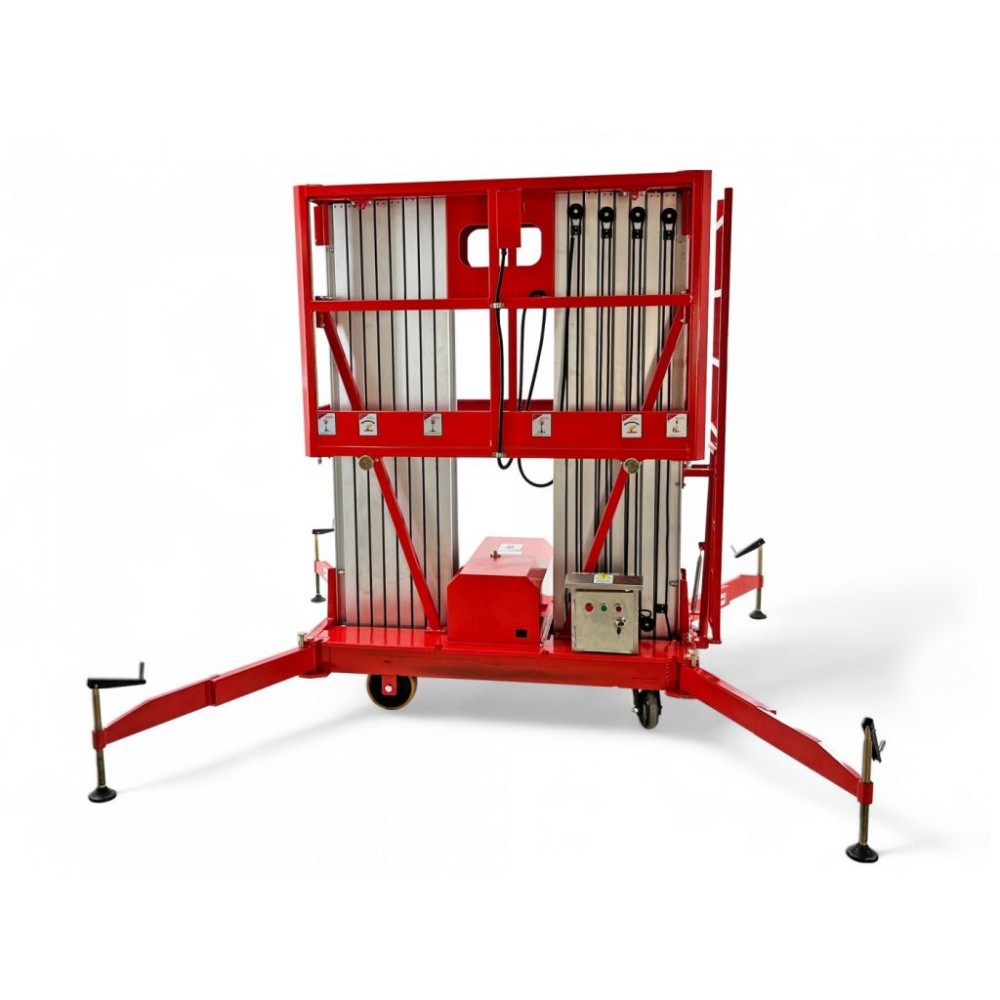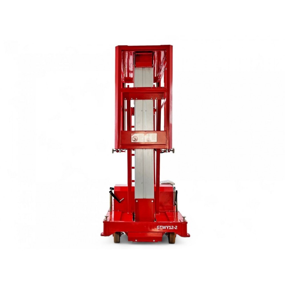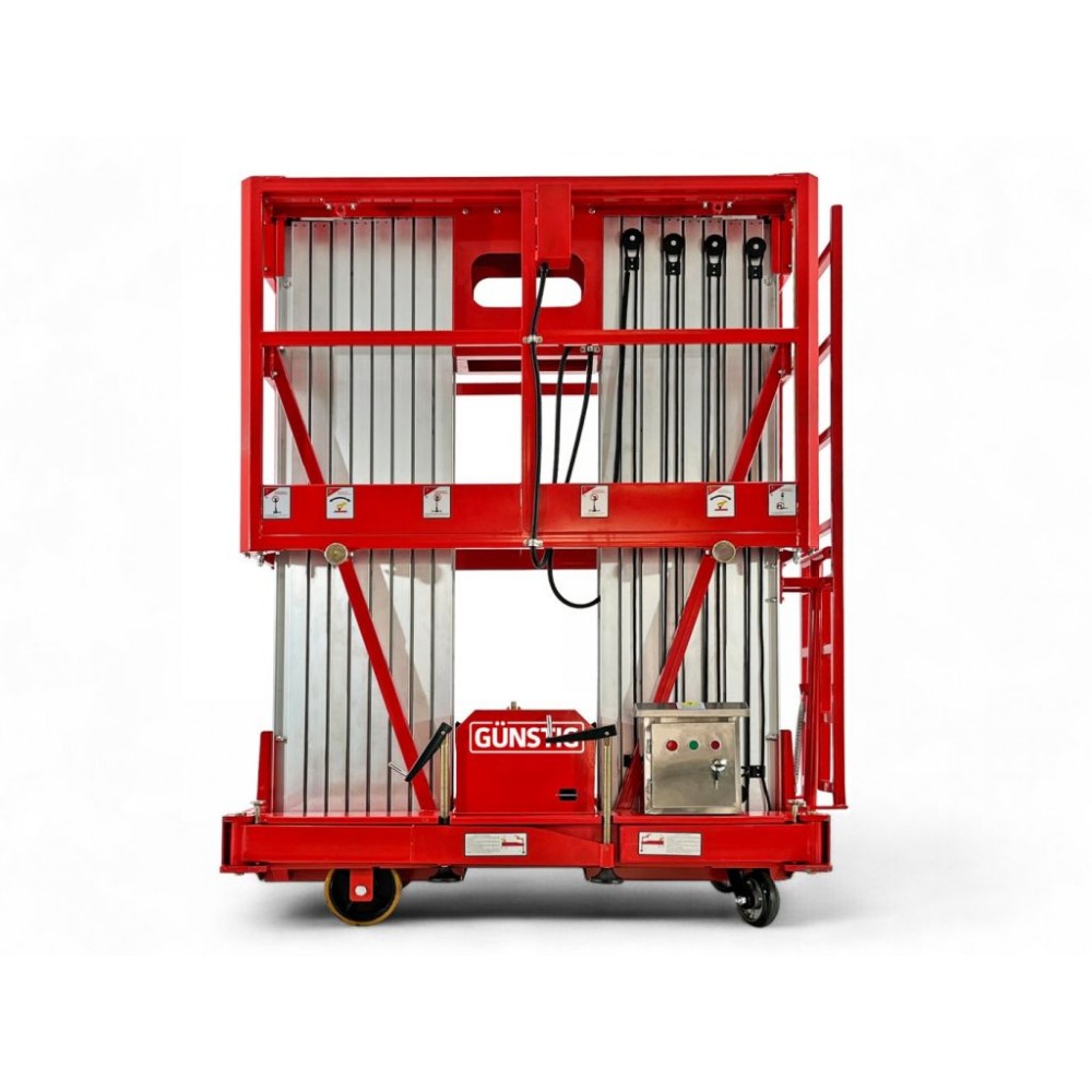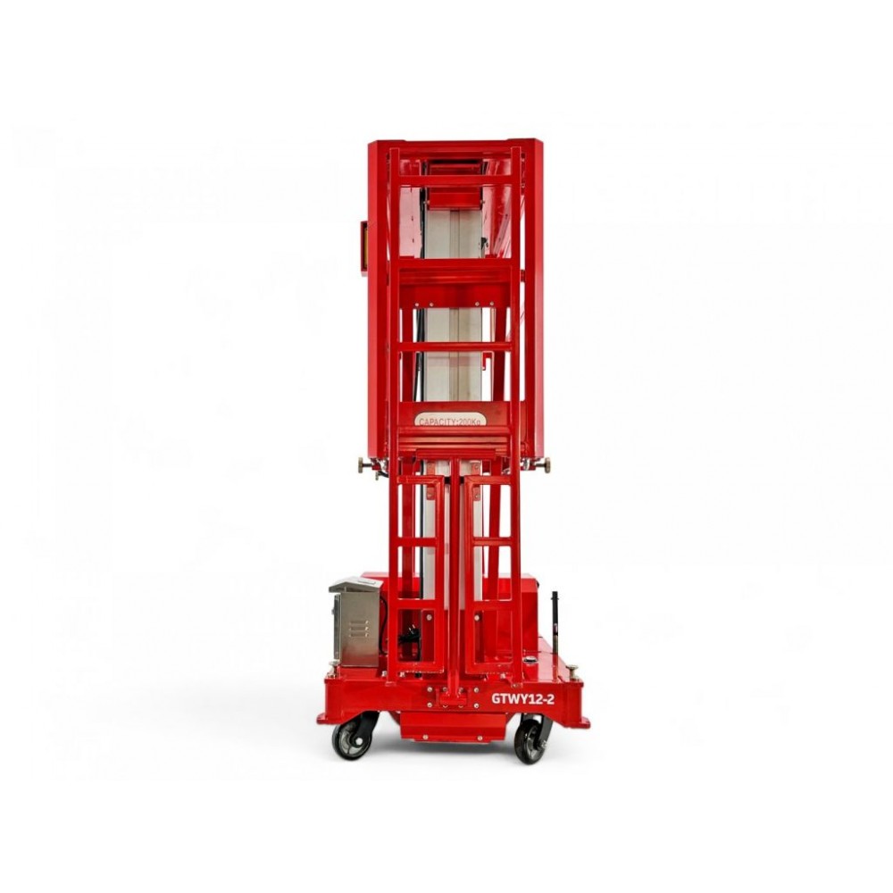 Телескопічний щогловий підйомник (двомісний) Günstig GTWY12-2 - це компактне, надійне обладнання для висотних робіт з висотою платформи 12 м і робочою висотою 13,7 м. 2 телескопічні щогли з високоміцного алюмінієвого сплаву та висувні опори (аутригери) із системою вирівнювання забезпечують стабільність платформи навіть на максимальній висоті. Розмір платформи 1500x600 мм і вантажопідйомність 200 кг дозволяють одночасну роботу 2 операторів. Підйомник оснащений електроприводом потужністю 1,5 кВт з живленням від мережі 230 В.