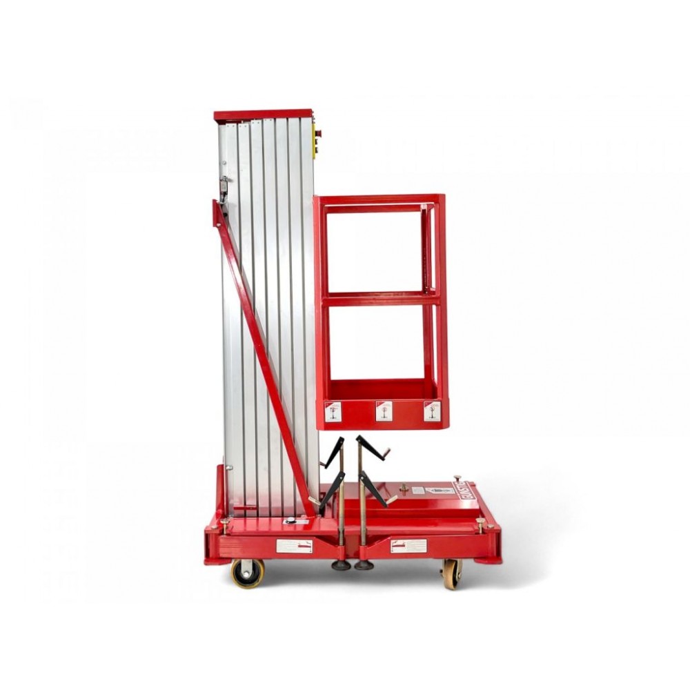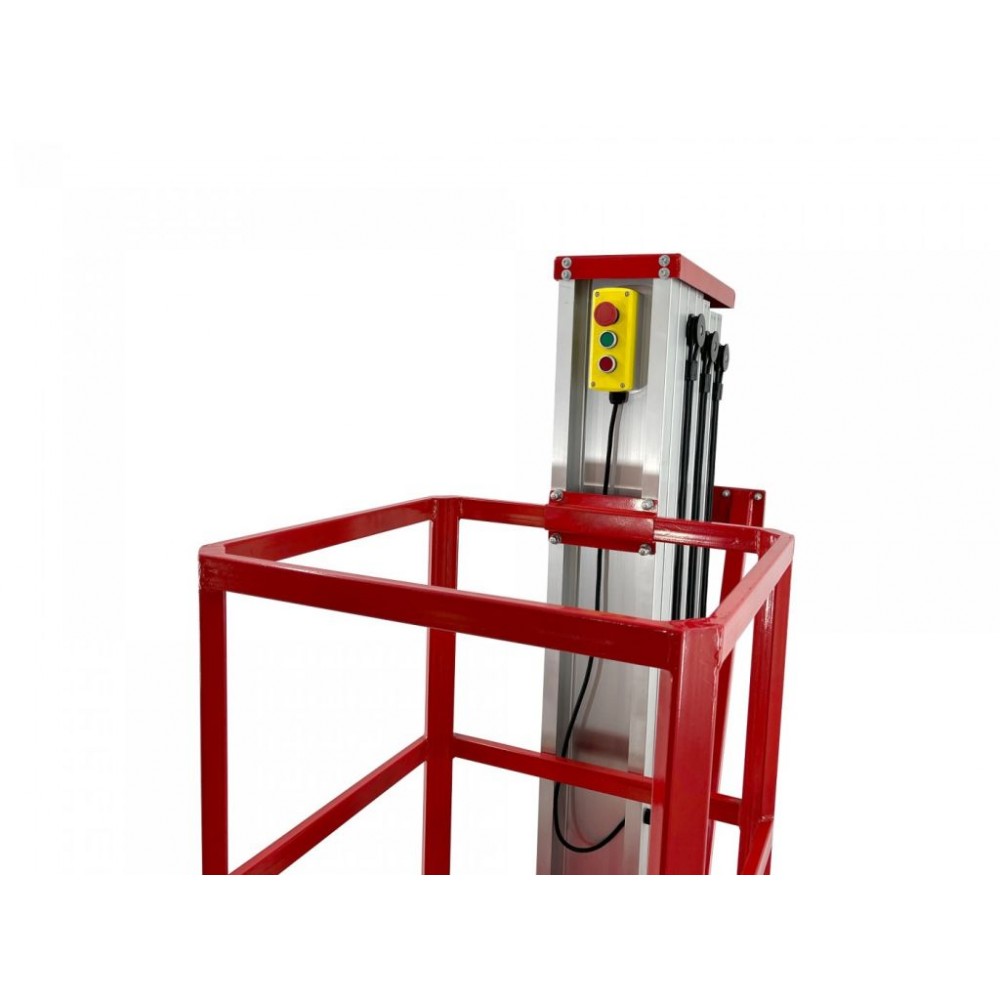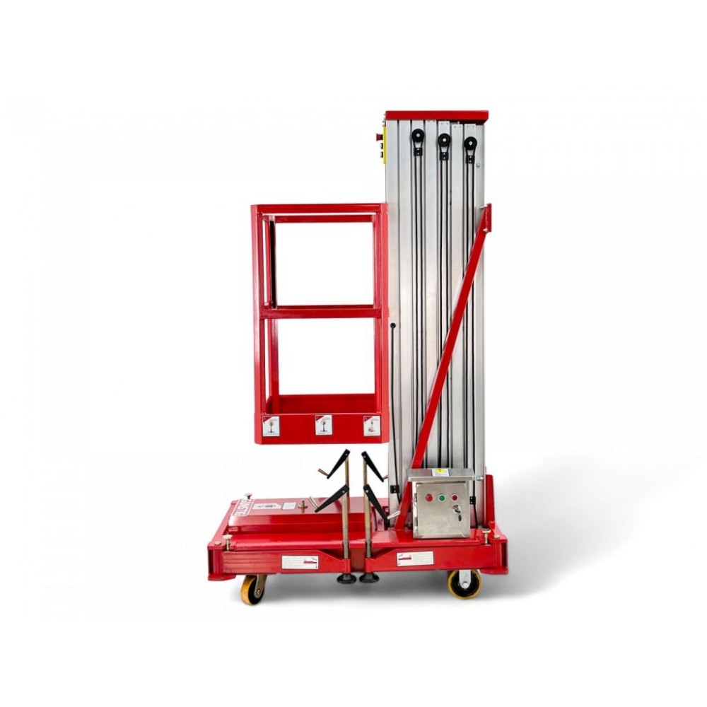 Для покращення стабільності на нерівних поверхнях підйомник оснащений стабілізаторами (опорами). За рахунок ширини всього 800 мм обладнання легко проїжджає у вузькі проходи, а поліуретанові колеса мають плавний хід і не пошкоджують поверхні. Для зручності і безпеки оператора є 2 панелі керування: на шасі (базі) підйомника і безпосередньо на платформі. Також цей компактний підйомник для внутрішніх робіт має кнопки аварійної зупинки на обох панелях керування.