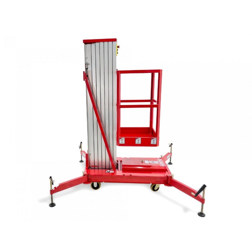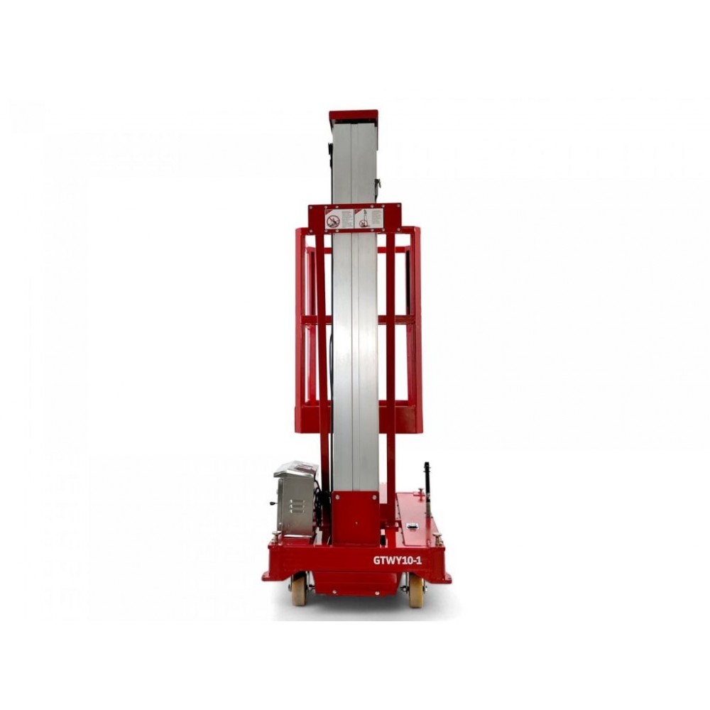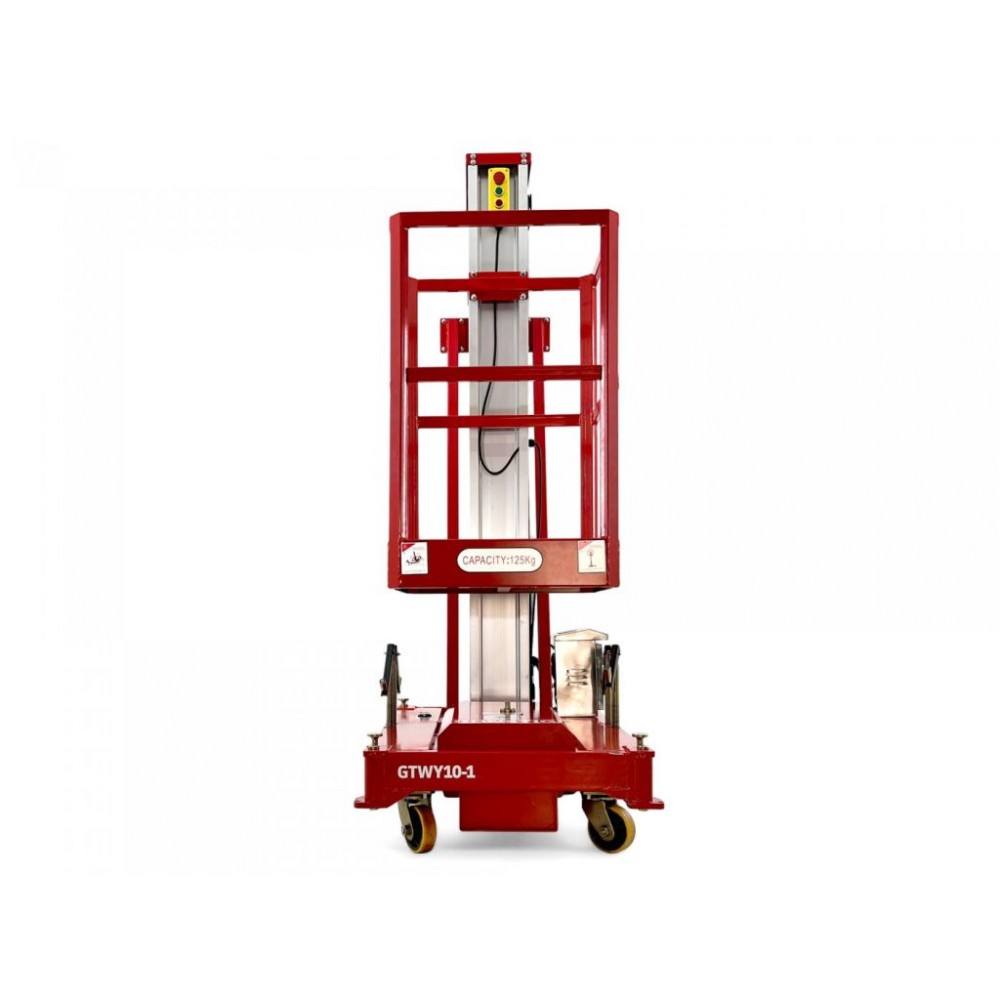 Телескопічний щогловий підйомник Günstig GTWY10-1 з живленням від електромережі 230 В призначений для внутрішніх робіт на висоті і має компактну конструкцію, яка дозволяє використовувати його у важкодоступних місцях. Платформа має розмір 650х600 мм і розрахована на 1 оператора (максимальне навантаження 125 кг). Висота платформи становить 10 м, робоча висота - 11,7 м. Потужність двигуна - 750 Вт.