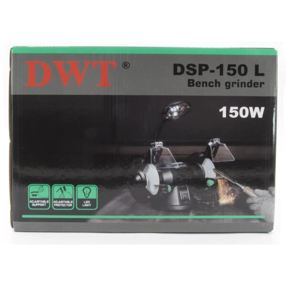 DWT DSP-150 L - електричний точильний верстат для заточування та шліфування інструментів з металу та дерева, а також садового та слюсарного інвентарю. Конструкція оснащена елементами, що знижують ризик травм під час роботи, та пристроями для точного позиціонування заготівлі. Застосовується у побутових майстернях, на невеликих виробничих ділянках та в ремонтних зонах.