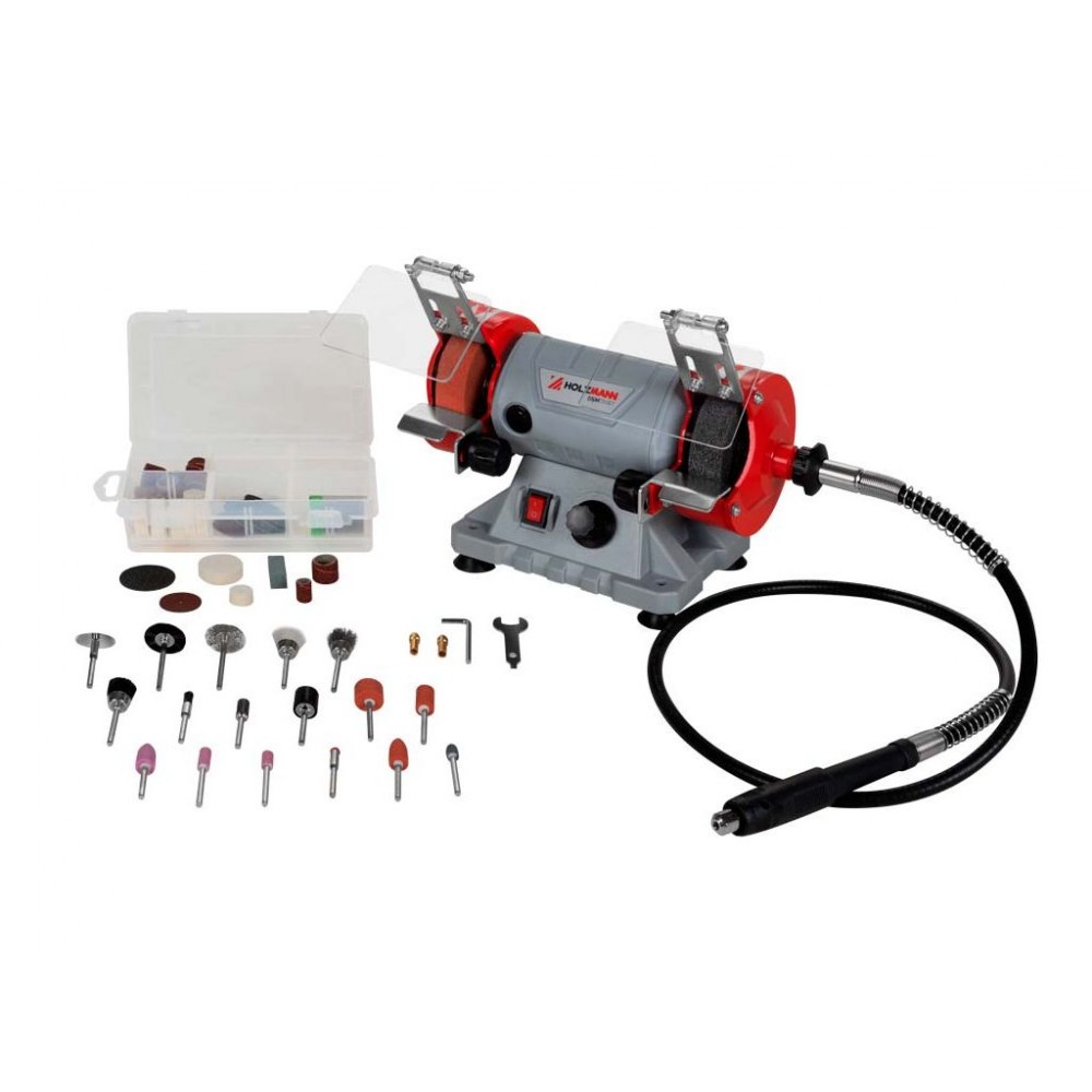Точильно-шліфувальний верстат Holzmann DSM75SET_230V - це багатофункціональний настільний пристрій, який дає змогу виконувати шліфування, заточування, гравірування та ряд інших операцій за рахунок двох кругів, полірувального і шліфувального, та гнучкого валу зі 110 насадками. Працює на базі асинхронного двигуна потужністю 110 Вт (230 В) та зі швидкістю обертання 9900 об/хв.