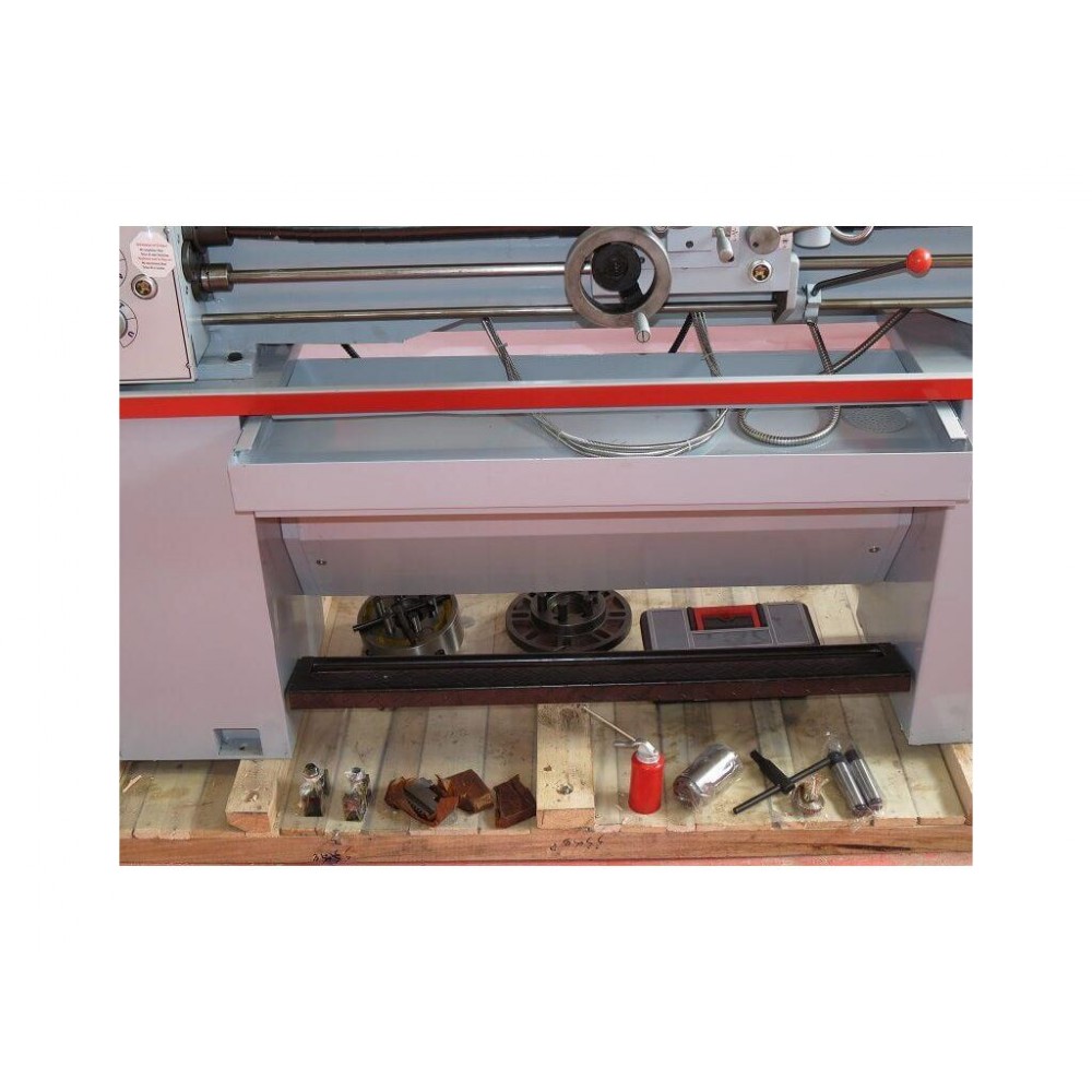 Комплект поставки: 3-кулачковий патрон _ 200 мм, включаючи змінні кулачки, 4-кулачкова планшайба _ 200 мм із зворотними кулачками, затискна шайба _ 250 мм, 2 нерухомих наполегливих центру КМ4, перехідна втулка КМ 6/4, нерухомий люнет, рухливий люнет, галогенна лампа робочого освітлення, перегородка для захисту від стружки, вузол охолодження, опорна рама з ножним гальмом, резьбоуказатель,1 комплект змінних коліс, інструмент для технічного обслуговування