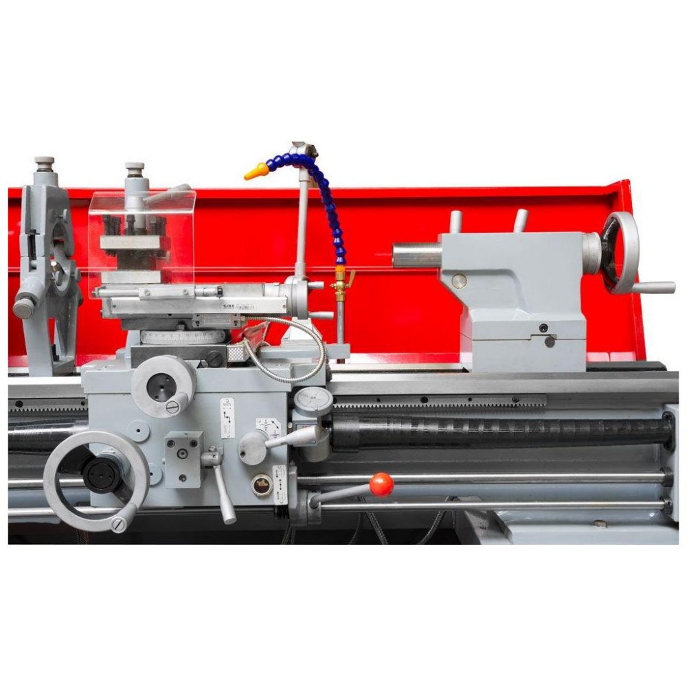 Комплект постачання: 3-вісний пристрій цифрової індикації, 3-кулачковий патрон 200 мм, включаючи змінні кулачки, 4-позиційний різцетримач, 4-кулачкова планшайба 200 мм зі зворотними кулачками, затискна шайба 250 мм, 2 нерухомих упорних центри, перехідна втулка КМ 6 / 4, нерухомий люнет, рухомий люнет, галогенні лампи робочого освітлення, перегородка для захисту від стружки, вузол охолодження, лита опорна рама, різьбовказівник, 1 комплект змінних коліс, інструмент для технічного обслуговування.