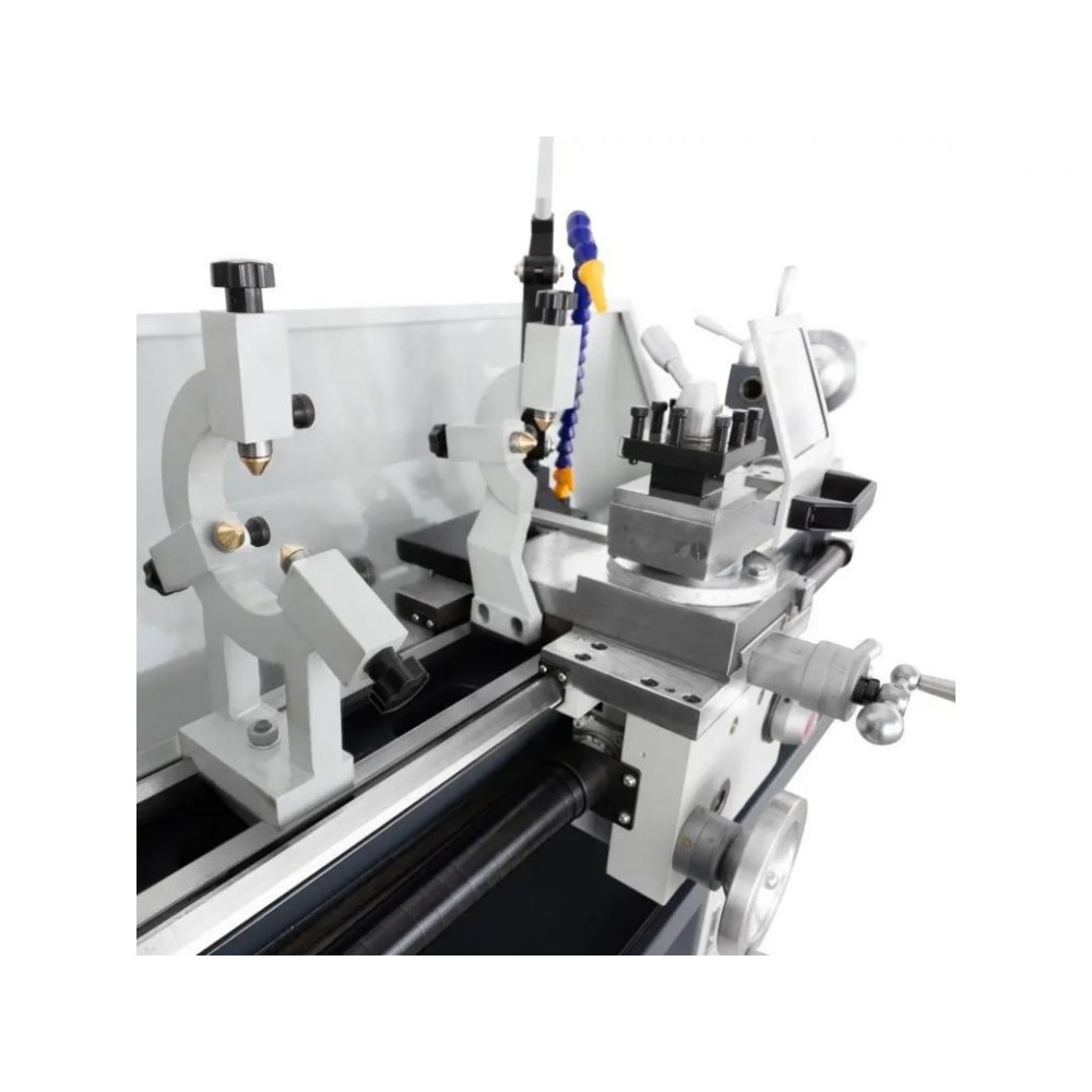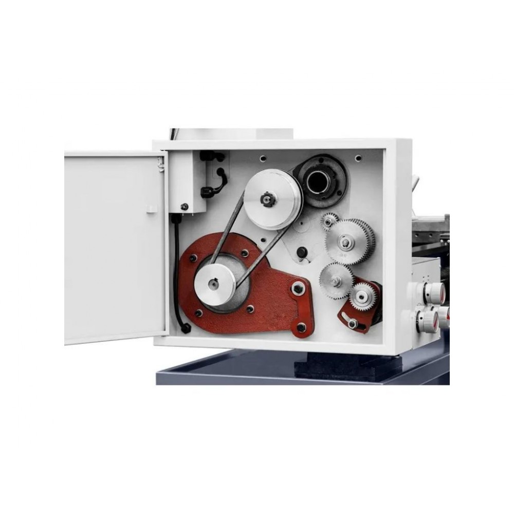 Перевагами представленої моделі є автоматичні поздовжня і поперечна подачі, просте регулювання швидкості шпинделя у діапазоні 25-1600 об/хв, поворот інструментальної каретки на ± 45° і механізм ковзання задньої бабки на ± 10 мм для обробки конусів. Завдяки масивній, стійкій станині з індукційно загартованою і точно відшліфованою напрямною, цей токарний верстат по металу працює практично без вібрацій і гарантує високоякісний результат.