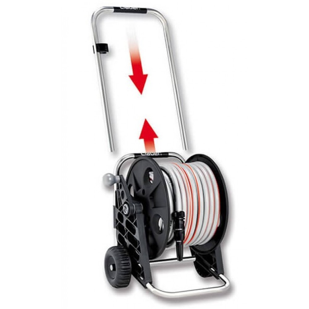 Візок для поливального шланга Claber Genius Compact Pronto 25 - пристосування для компактного зберігання і зручного використання садового шланга для поливу газону і рослин. Представлена модель обладнана ручкою, яку можна без проблем подовжити або вкоротити, залежно від потреб користувача.