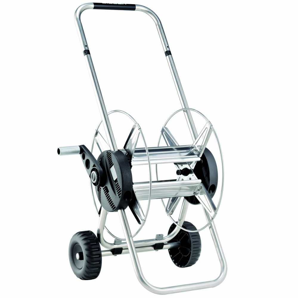 Візок для поливального шланга Claber Metal Compact - пристосування для компактного зберігання і зручного використання садового шланга для поливу газону і рослин. Представлена модель обладнана телескопічною ручкою, яку можна без проблем подовжити або вкоротити, залежно від потреб користувача. Барабан і корпус повністю виготовлені з нержавіючої сталі, що захищає візок від впливу агресивного зовнішнього середовища.