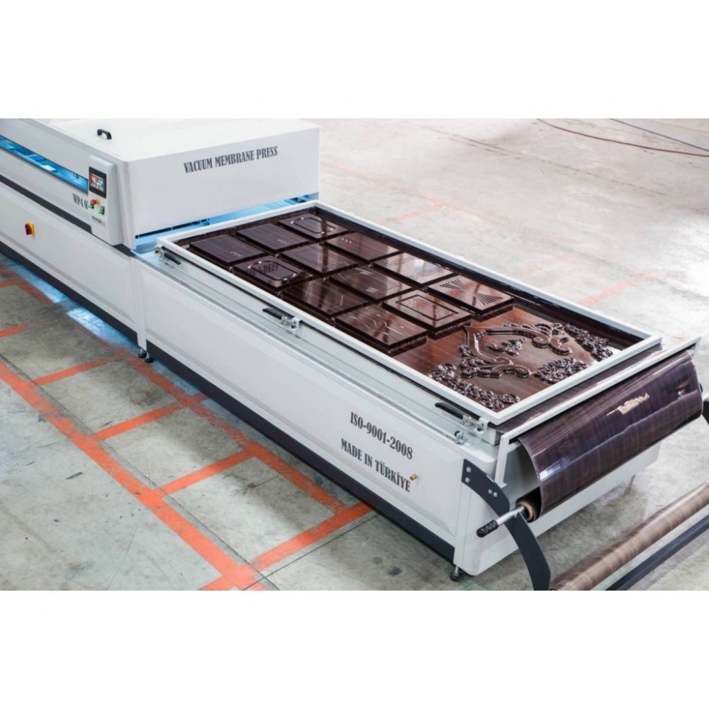 Це професійний верстат, де використовують плівку PVC і GPET для ламінування як 3D, так і плоских поверхонь МДФ, фанери, натуральної деревини.