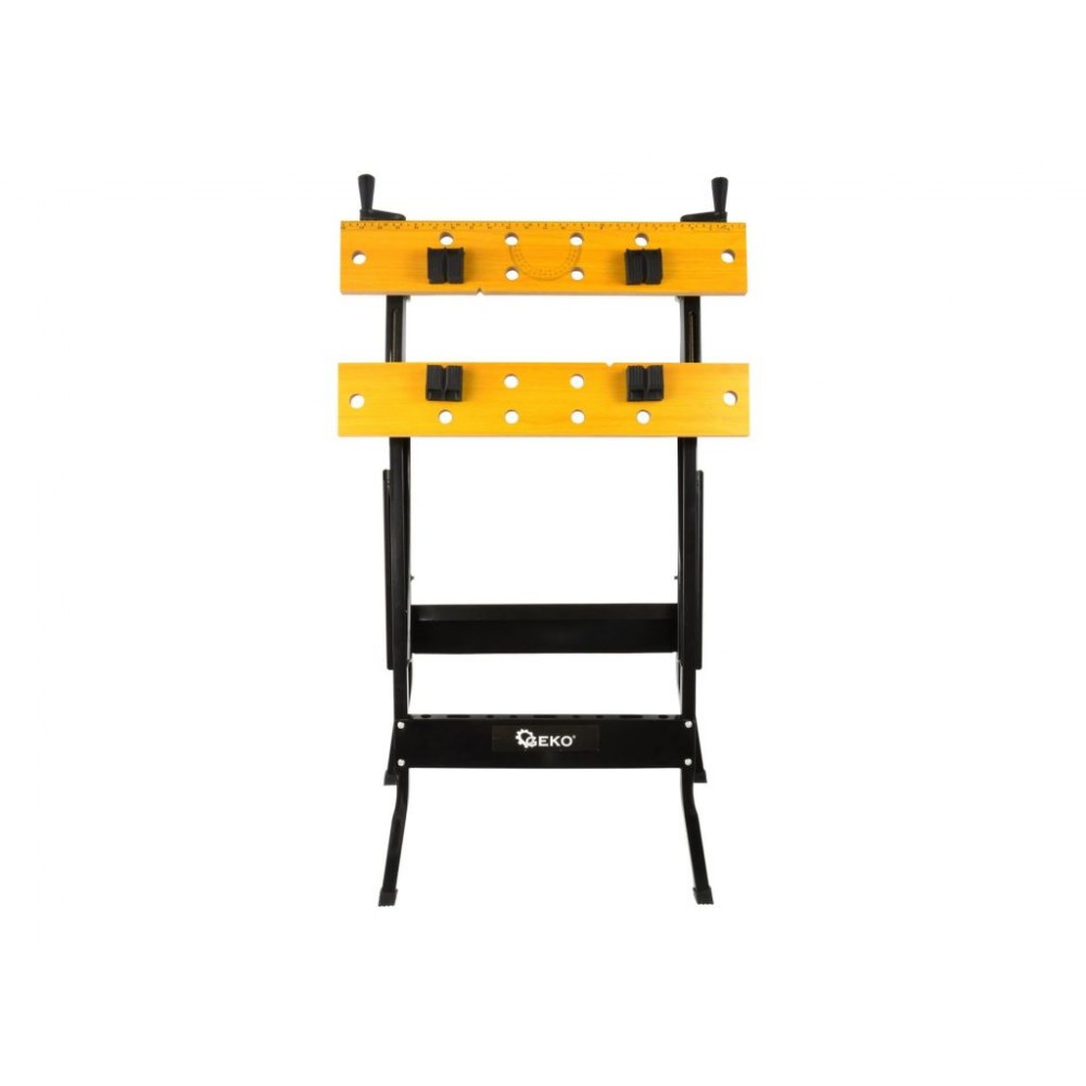 Верстак GEKO G10871 призначений для широкого використання на промислових підприємствах, у майстернях та навчальних закладах. Конструкція столу дозволяє регулювати положення стільниці та її ширину відповідно до форми предмета, який ви хочете на ній розмістити. Крім того, стільниця укомплектована затискними губками, які дозволяють кріпити на столі предмети різної форми. Регулювання столу здійснюється за допомогою ручок, розташованих на його правій і лівій стороні.