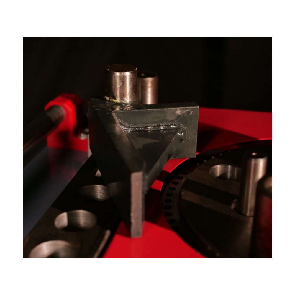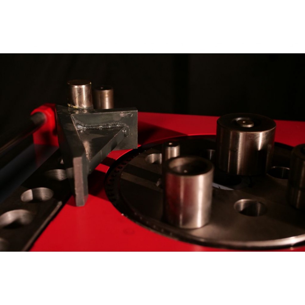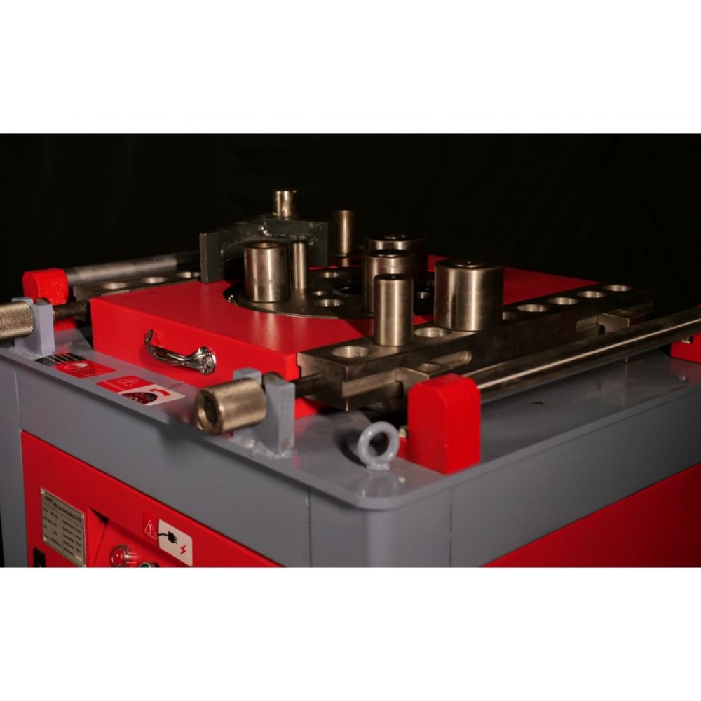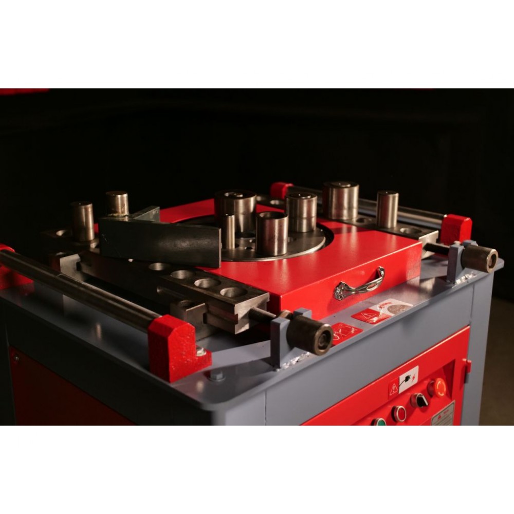 Верстат забезпечує регулювання кута згинання в діапазоні від 0° до 180°, що дає змогу виготовляти складні елементи для будівельних конструкцій. Можливість згинати кілька прутків одночасно (за умови, що їх сумарний діаметр не перевищує 40 мм) дозволяє збільшити продуктивність роботи. За рахунок посилених робочих вузлів і якісних матеріалів виготовлення цей верстат для гнуття арматури матиме тривалий термін служби навіть при інтенсивній експлуатації.