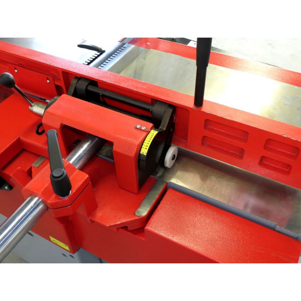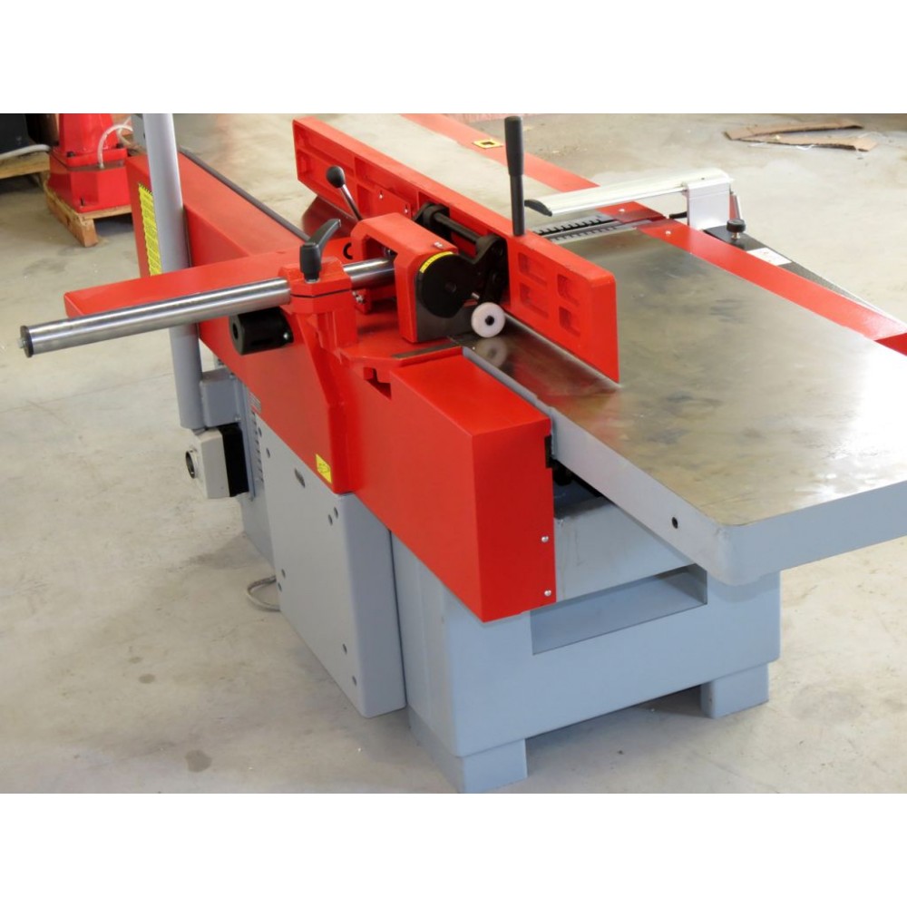 Масивна лита станина верстата відмінно поглинає вібрації, забезпечуючи стабільність і точність обробки. Столи виконані з литого чавуну і мають відшліфовану поверхню для покращення ковзання заготовок. Регулювання висоти столів здійснюється за допомогою системи важелів, з'єднаних у вигляді паралелограма. Налаштування глибини стругання виконується великим маховиком зі шкалою. Для максимальної точності стругання є поворотний фугувальний упор (45°- 90°). Цей професійний фугувальний верстат має глибину стругання до 8 мм без втрати якості обробки, що забезпечує його високу продуктивність.