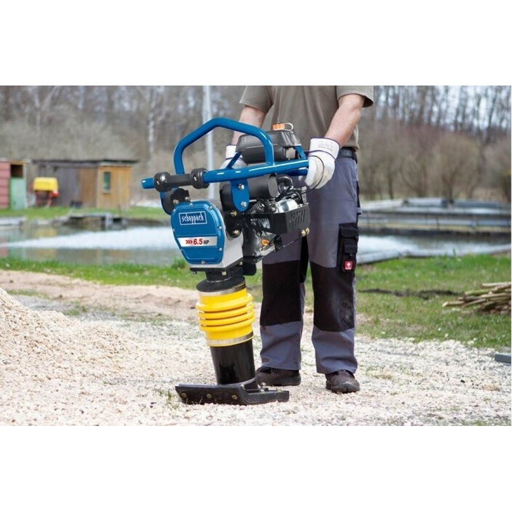 Агрегат SCHEPPACH VS 1000 состоит из кривошипно-шатунного механизма (или вибровозбудителя) и рабочего органа — ударной подошвы (или плиты). В основе привода модели - достаточно мощный (5,5 л.с.) четырехтактный бензиновый двигатель, который характеризуется экономным расходом топлива, минимальными шумовыми показателями и повышенным моторесурсом. Привод возбудителя агрегата SCHEPPACH осуществляется посредством зубчатой передачи: поршень, находясь в возвратно-поступательном движении, формирует переменную по величине и направлению возбуждающую силу. Результат действия данной силы — от 450 до 650 ударов трамбующей плиты в минуту. Таким образом обеспечивается не только оптимальный режим вибрационного уплотнения, но и перемещение всей конструкции.