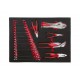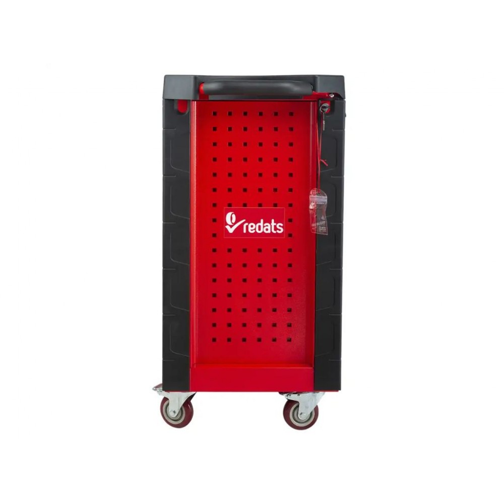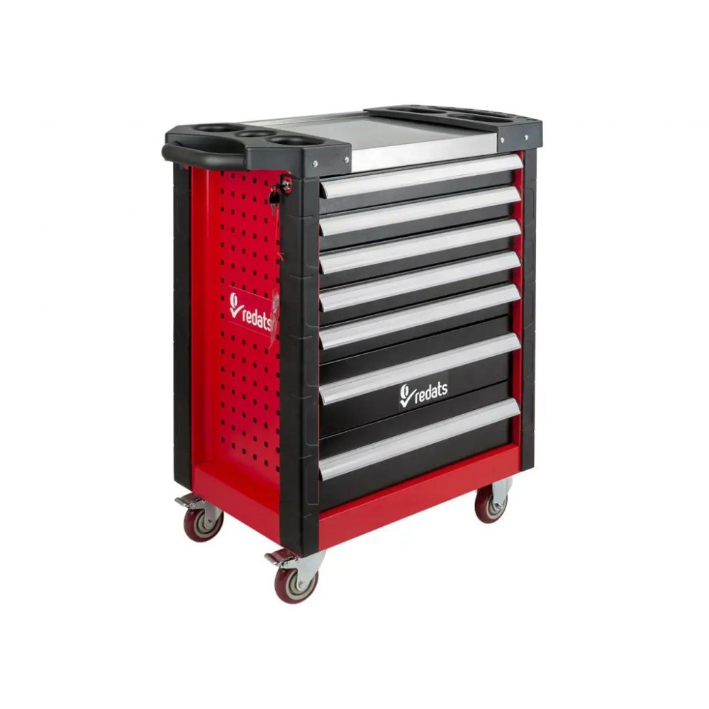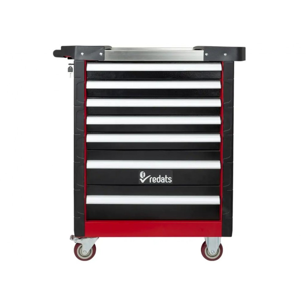 Візок для майстерні з інструментами REDATS буде вигідним придбанням для майстрів будь-якого профілю, адже містить 420 найбільш використовуваних професійних інструментів. 7 ящиків на шарикопідшипникових напрямних закриваються на центральний замок, тому ваш інструмент завжди буде в безпеці. Кожен ящик має сітчасту поролонову підкладку для мінімізації вібрацій і запобігання ковзанню інструменту при транспортуванні. Візок виготовлений з дволистової сталі і доповнений захисними куточками з перфорованої гуми.