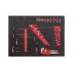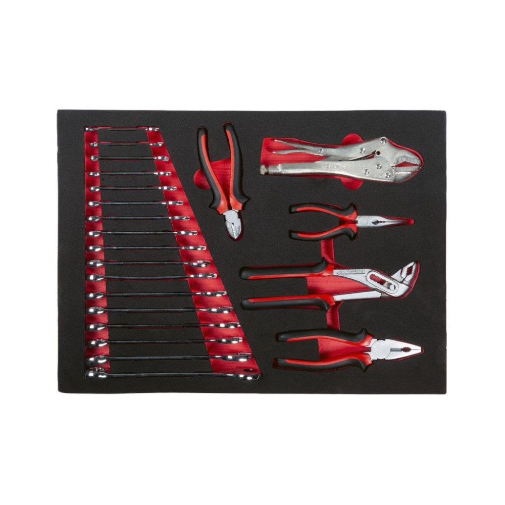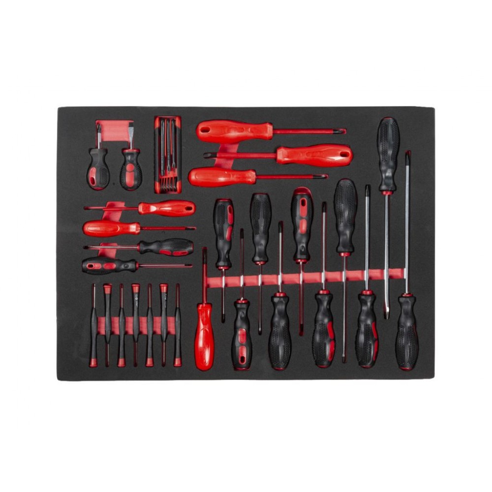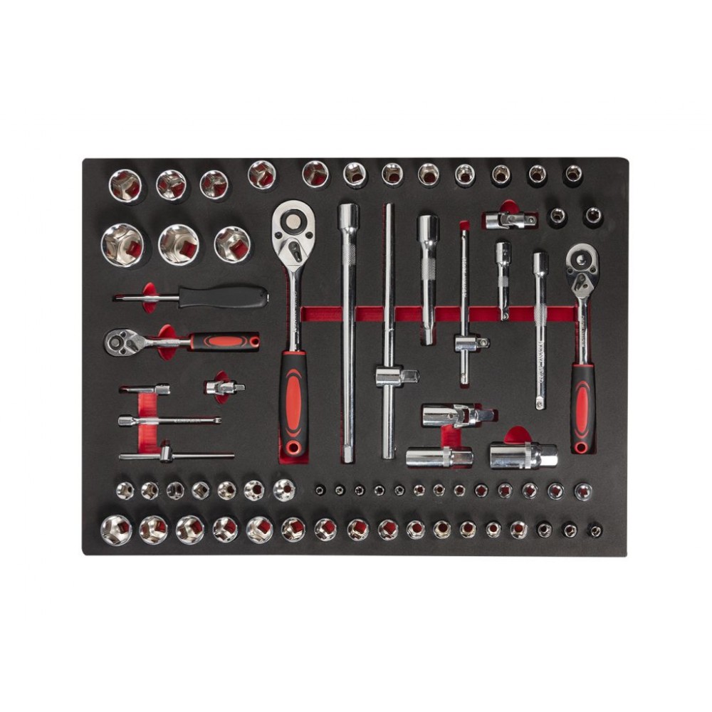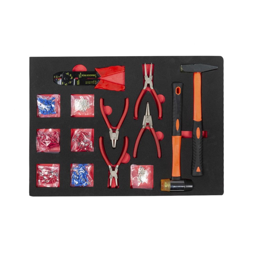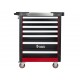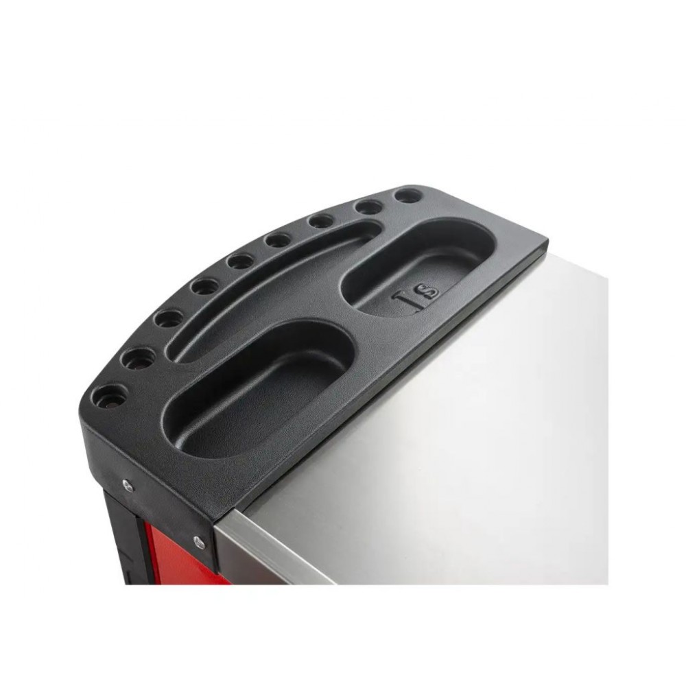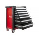 Інструмент посортований на кілька груп і розміщений у 5 верхніх ящиках. 2 нижні ящики порожні і призначені для великого обладнання. Бічні поверхні візка мають кріпильні отвори для підвішування дрібних аксесуарів. Колеса з термопластичної гуми діаметром 12,5 см мають плавний хід і забезпечують легке переміщення візка по різних поверхнях. Цей візок з інструментом міцний і довговічний, тому служитиме довго і надійно.