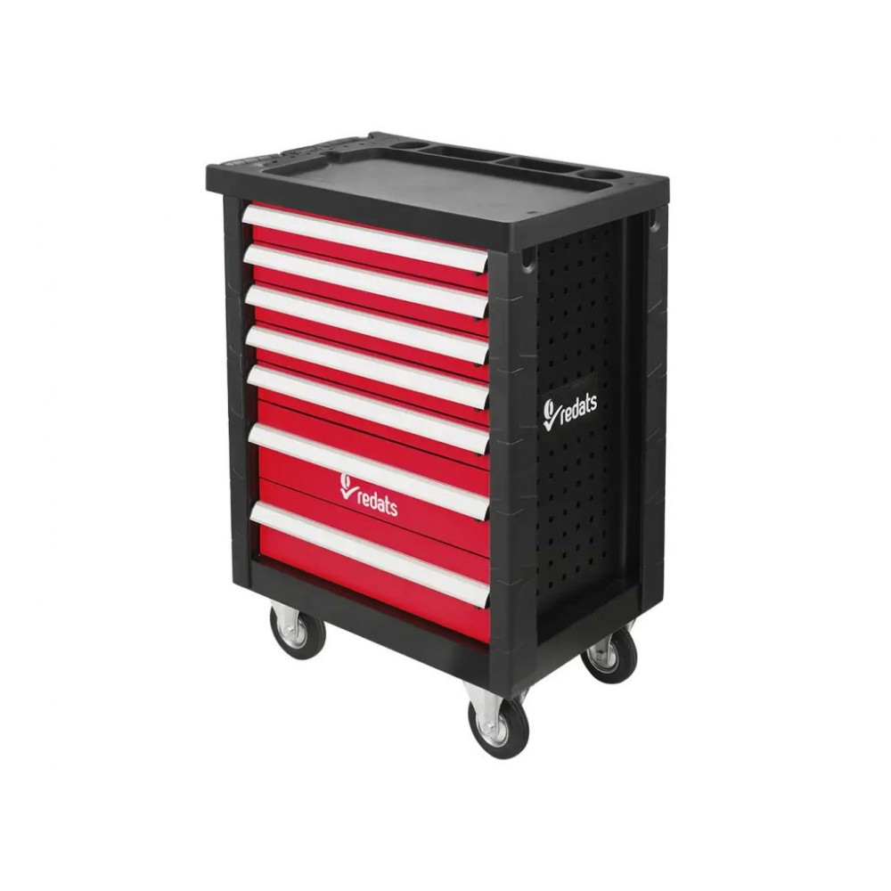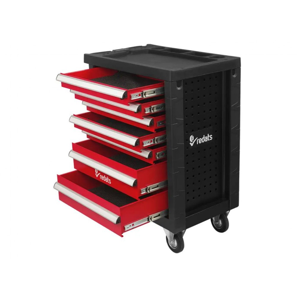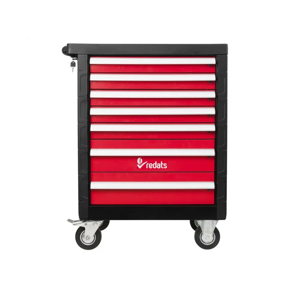 Професійний візок для інструменту REDATS - це справжня знахідка для майстерень різного профілю, адже з його допомогою можна зручно організувати інструменти і завжди мати все необхідне під рукою. 7 висувних ящиків різної висоти витримують навантаження до 40 кг кожен. Ящики оснащені сітчастою поролоновою підкладкою, яка гасить вібрації і запобігає ковзанню інструментів при транспортуванні. Всі ящики можна одночасно замкнути за допомогою центрального замка.
