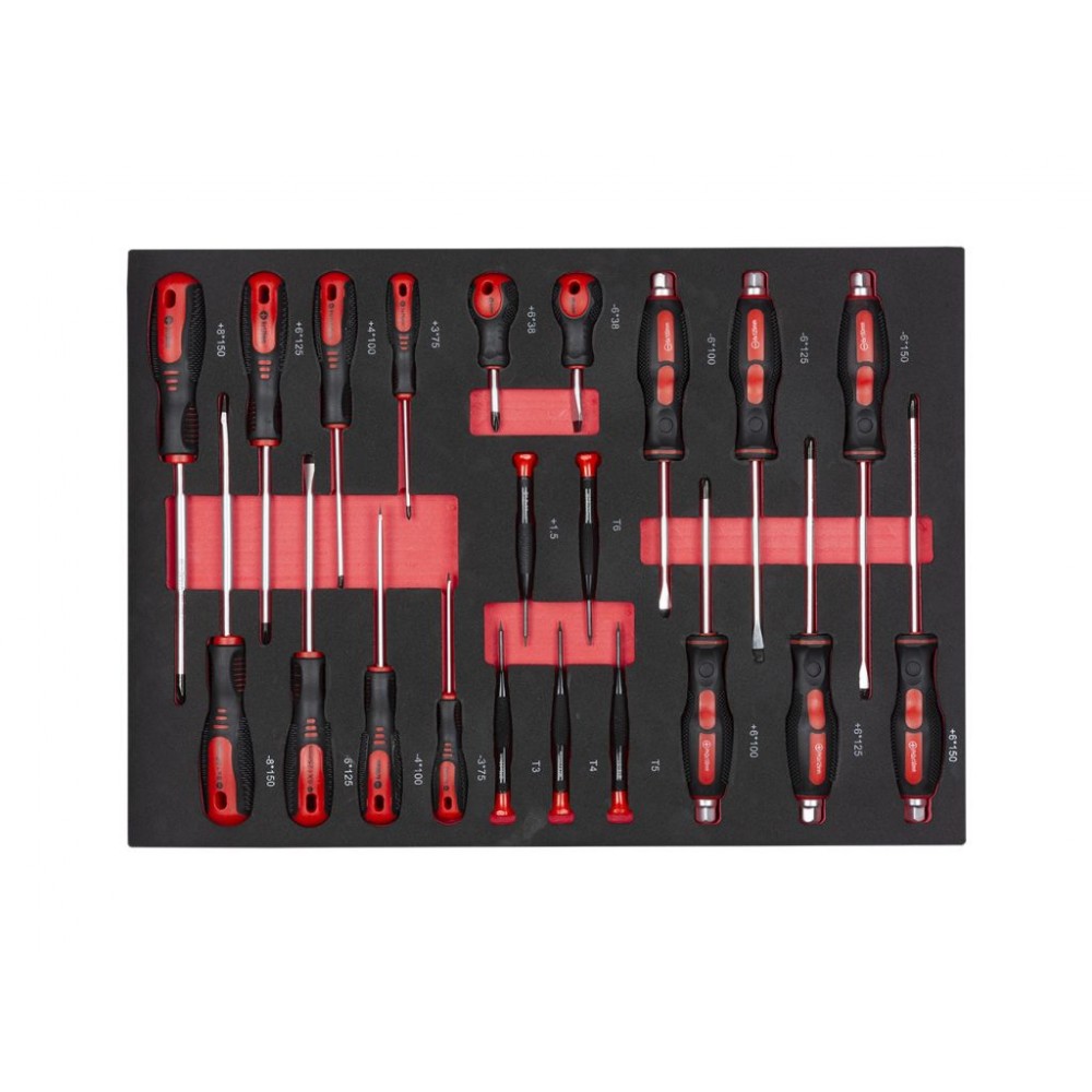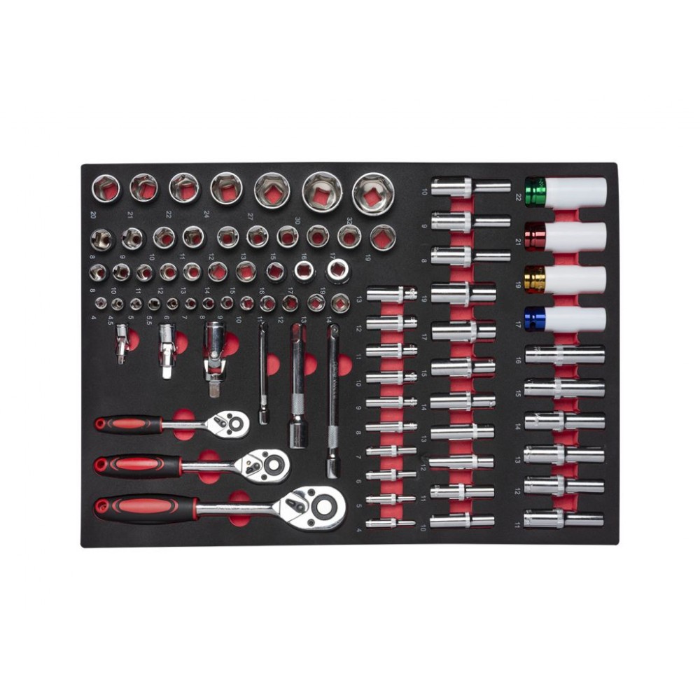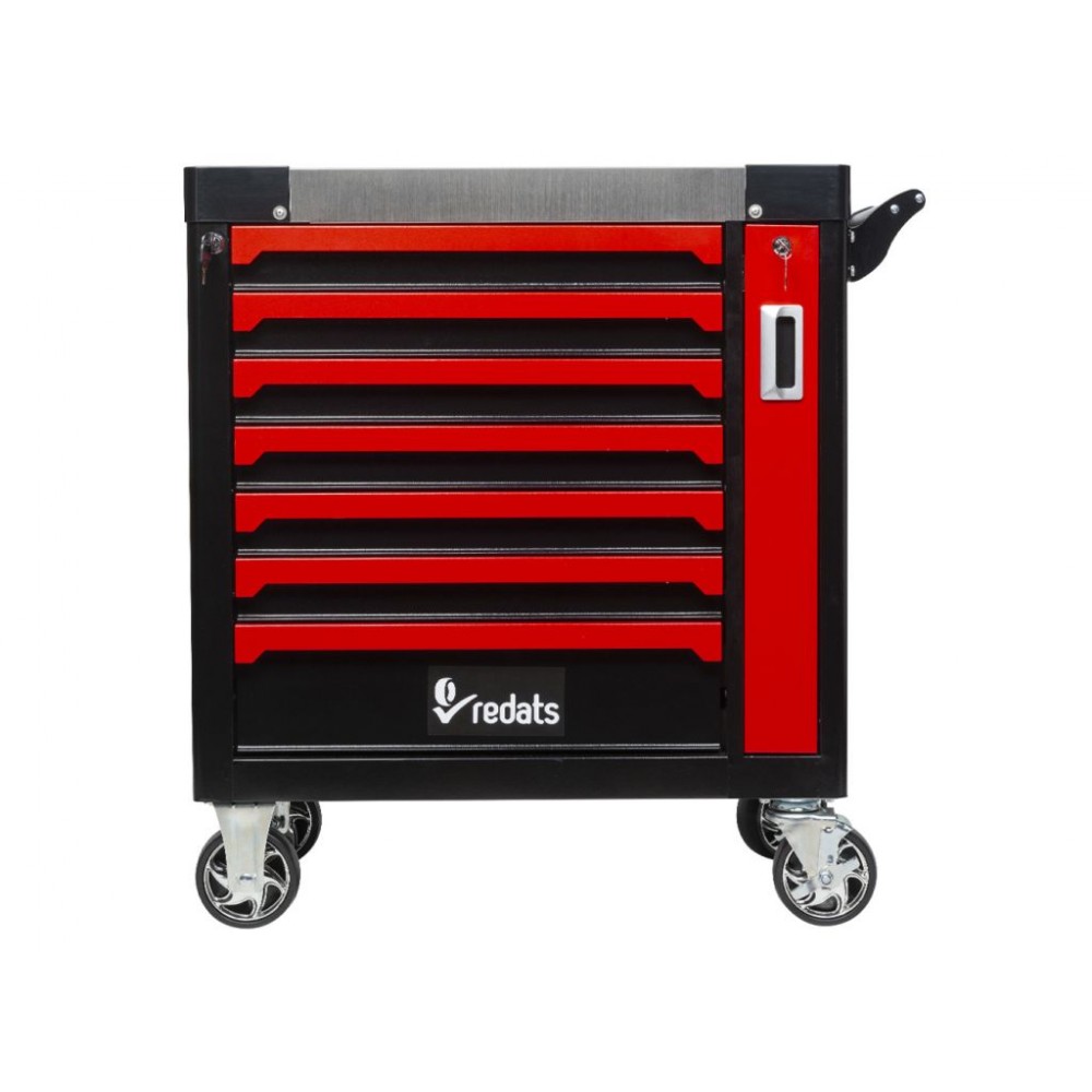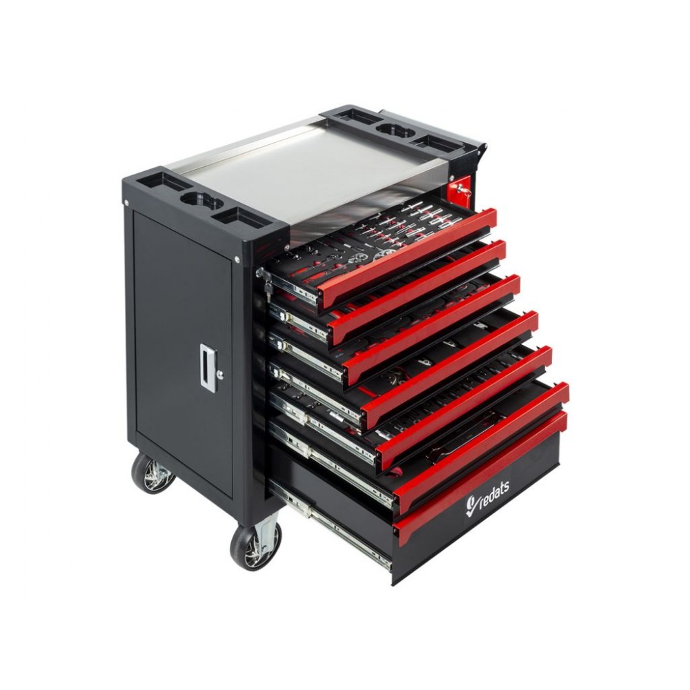 Візок з інструментом REDATS 7+2 стане відмінним придбанням для будь-якої ремонтної майстерні, адже він зручний, надійний і повністю укомплектований необхідним для робіт інструментом у кількості 258 одиниць. 7 містких ящиків з шарикопідшипниковими висувними механізмами легко відкриваються, тому ви швидко отримаєте доступ до потрібних інструментів. Поролонові ложементи запобігають зміщенню інструментів під час транспортування, а центральний замок дозволяє одним рухом закрити всі ящики. 2 перфоровані стінки, одна з яких висувна, а друга - бічна і закривається металевими дверцятами, дають змогу зберігати під рукою часто використовуваний інструмент.