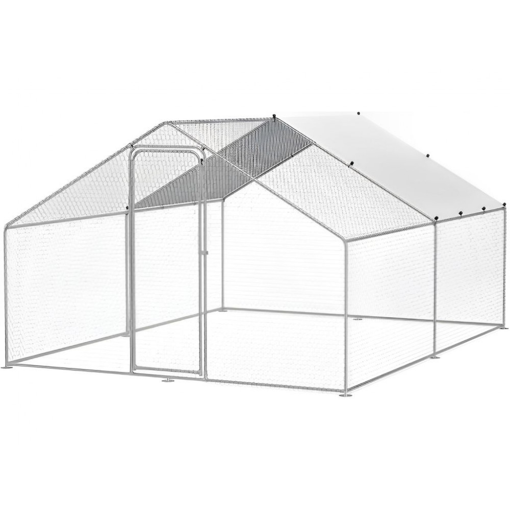 Рама виготовлена з оцинкованої сталевої труби діаметром 25 мм. Стійка до розриву, обгумована ПВХ сітка з отворами 0,9 мм надійно захищає птахів від хижаків і запобігає їх втечі. Сітка кріпиться за допомогою кабельних стяжок. Для захисту птиці від палючого сонця, дощу і граду є водонепроникне, стійке до ультрафіолетових променів накриття. Вольєр має високу стійкість за рахунок фіксаторів опор до грунту. Якщо ви шукаєте зручний і міцний вольєр для курей чи іншої домашньої птиці, ця модель задовольнить усі ваші вимоги.