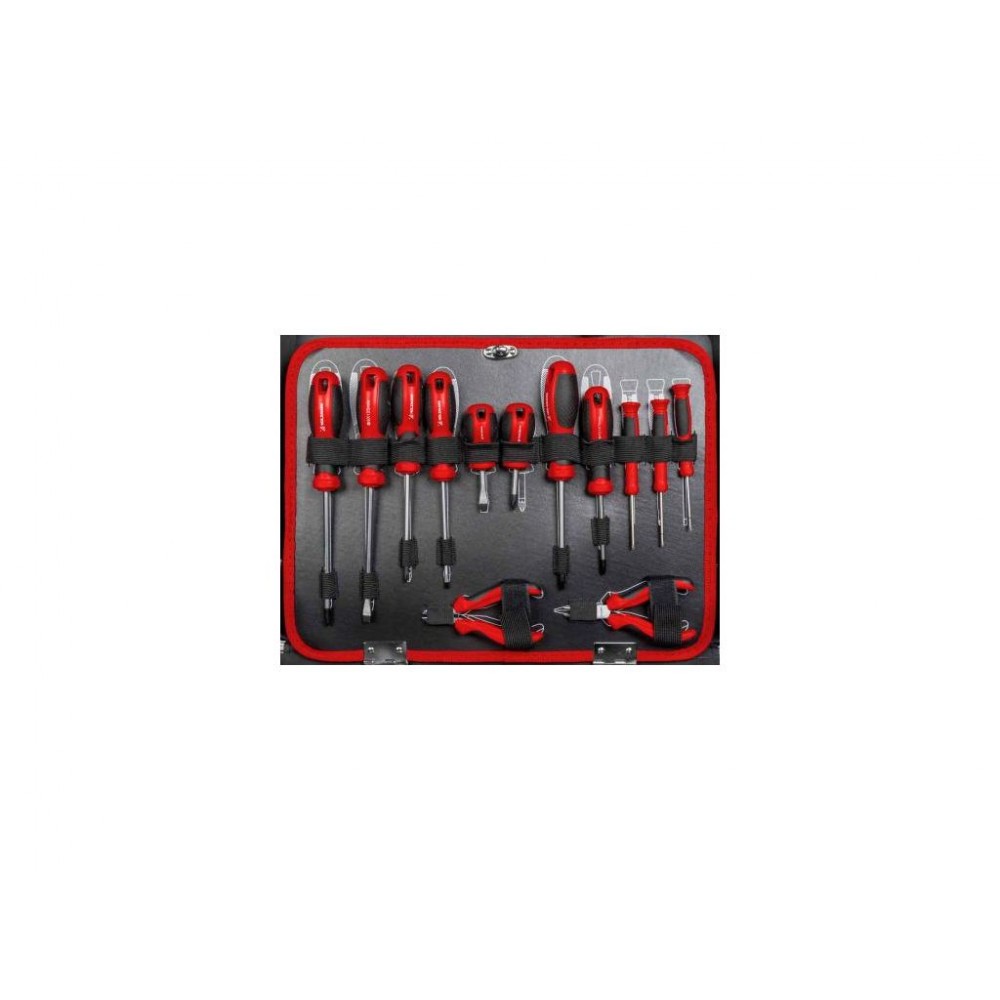 Ящик виготовлений з міцного, стійкого до пошкоджень пластику та зносостійкого алюмінію, має ручку для переміщення і 2 замки. Інструменти розміщені у 4 відділеннях, зроблених по типу органайзерів, де кожен інструмент має своє місце. У закритому вигляді розмір ящика становить 450х340х160 мм, що дозволяє компактно зберігати його у будь-якому приміщенні. Всі інструменти виготовлені з високоякісних, зносостійких матеріалів, що гарантує їх тривалий термін служби. На сайті KMA.UA ви можете замовити такий ящик з інструментами за вигідною ціною, так як ми є офіційним постачальником виробника в Україні.