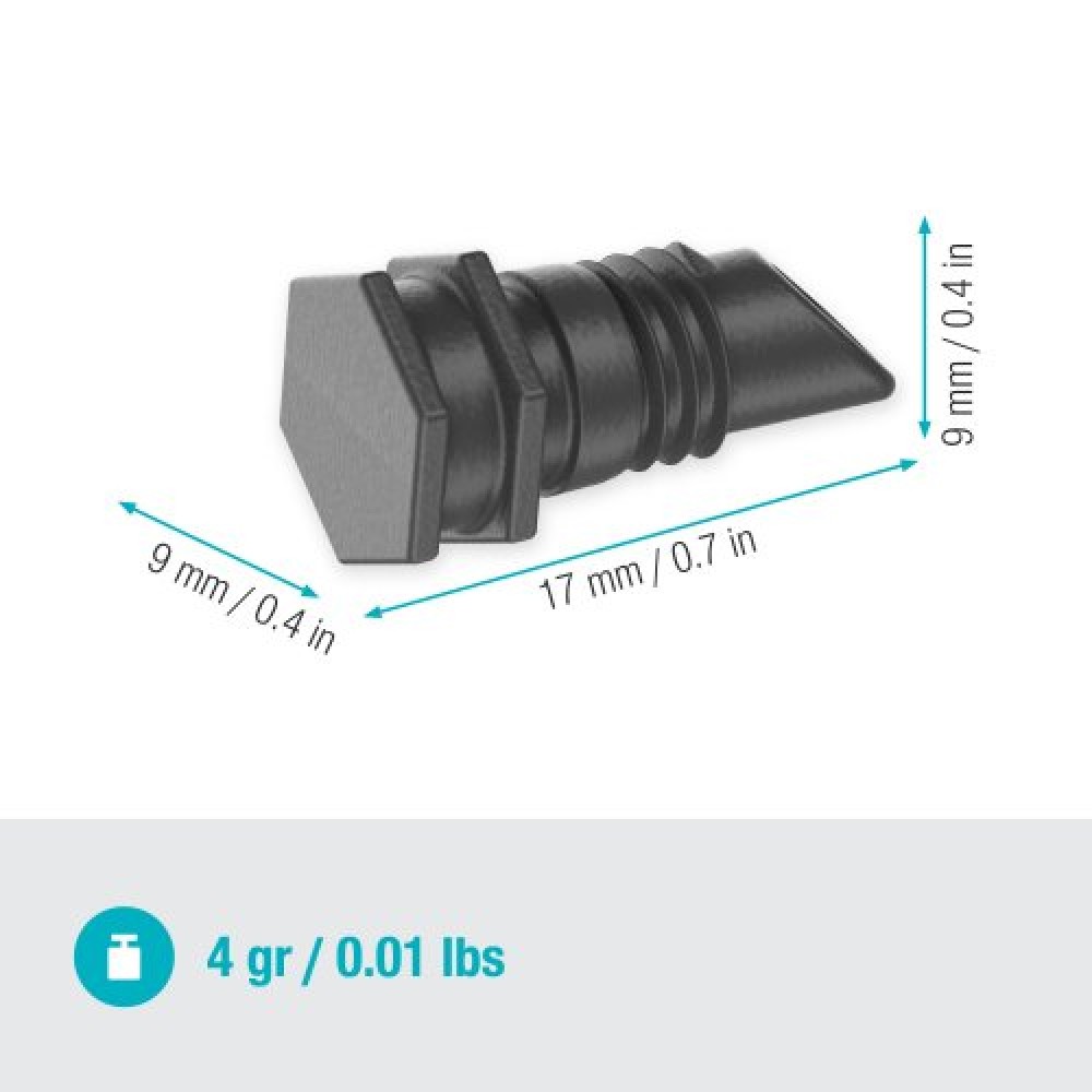 Заглушка Gardena Micro-Drip-System для шлангів 4,6 мм 3/16" 10 шт. — призначена для встановлення на кінець трубок мікрокрапельного поливу діаметром 4,6 мм. Також може перекривати воду в раніше виконаних отворах на лінії крапельного поливу. Може використовуватися багаторазово. Поставляється в комплекті - 10 шт. Виготовлено в Європі.