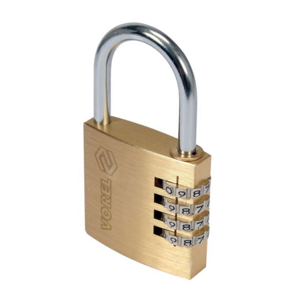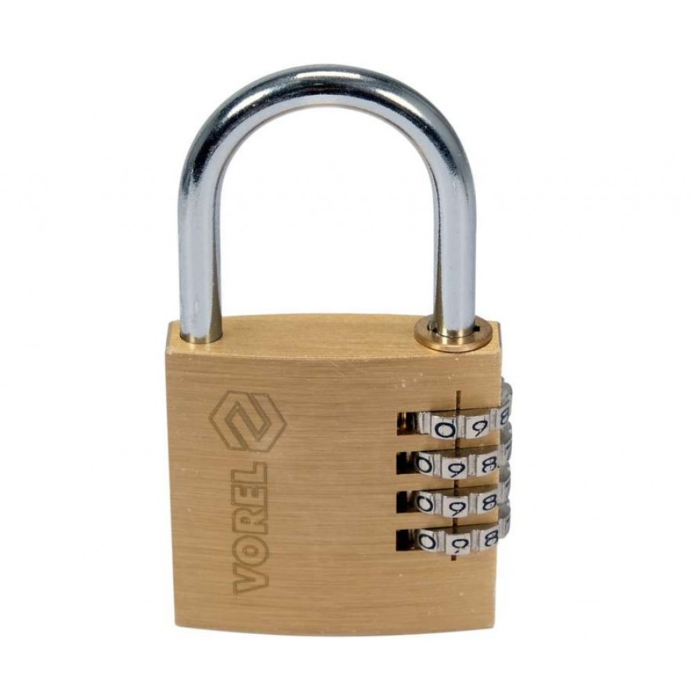 Замок навісний з кодовим замиканням VOREL: латунний корпус- 40х 11,8х39,5 мм, стал дуга- 30х25х 5 мм
