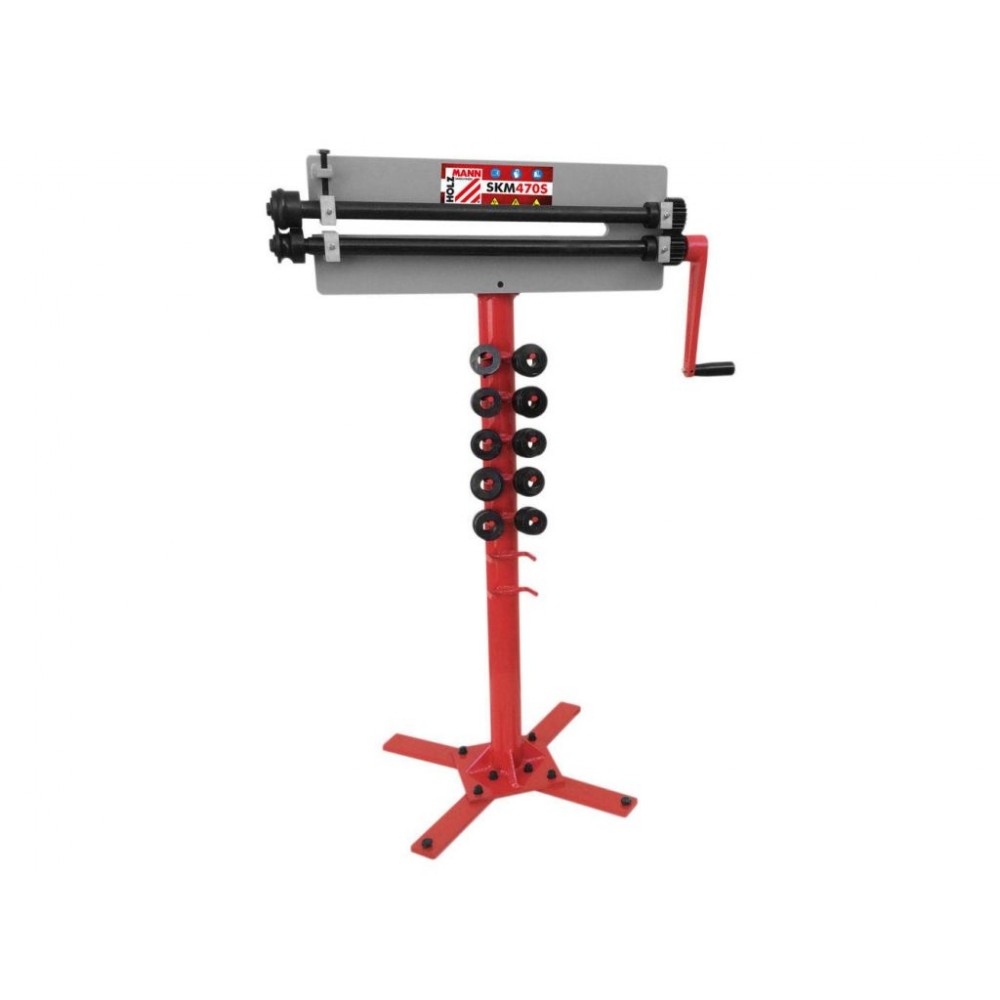 Робоча глибина становить 470 мм, відстань між роликами - 50 мм. Стійка з 4 опорами дає змогу зручно встановити верстат на будь-якій робочій поверхні і доповнена гачками для зберігання змінних роликів. Проста експлуатація та компактний розмір дозволяють ефективно використовувати модель в умовах обмеженого робочого простору, а міцні та якісні матеріали виготовлення гарантують тривалий термін служби. Такий зигувальний ручний верстат відмінно підійде для невеликих виробництв.