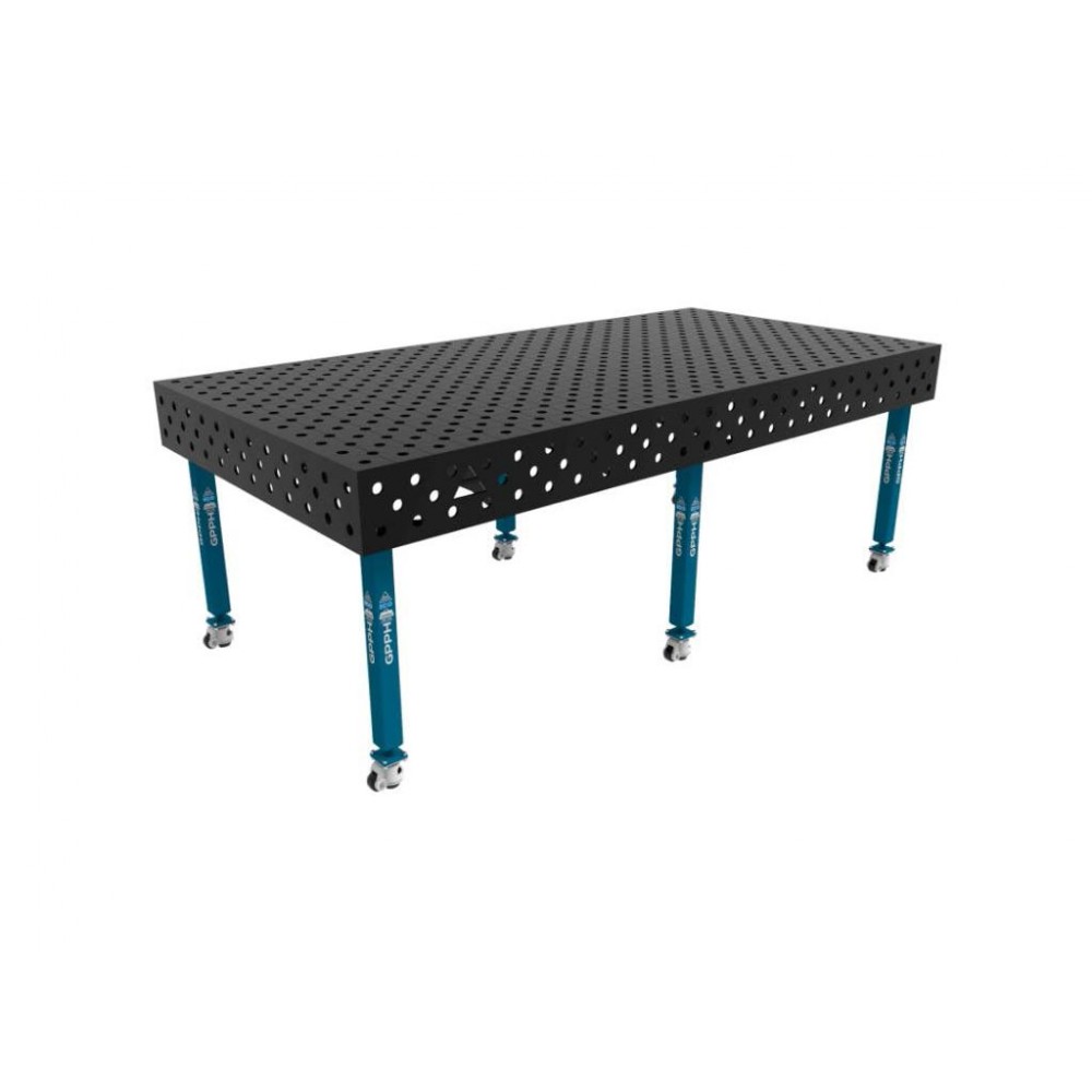 Щільне ребро стільниці та допуск площинності ±0,5 мм забезпечують ідеально рівну робочу поверхню і точну та стабільну основу для деталей. Поверхня оснащена фрезерованими, скошеними отворами з допуском розміру ±0,1 мм. Гравірована шкала з діагональною сіткою 50х50 мм дозволяє точно позиціонувати конструкцію, а також підходить для роботизованих зварювальних станцій. Ніжки виготовлені з профілю 60х60 мм, вантажопідйомність - 250 кг на ніжку. На вибір можуть бути ніжки з колесами або зі ступнею, тому ви можете купити зварювальний стіл під свої виробничі потреби.