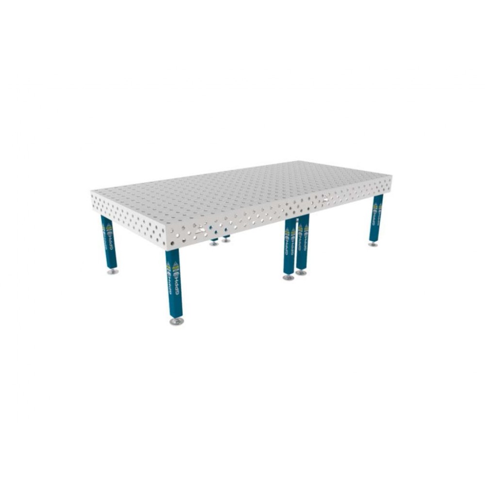 Товщина стільниці 12 мм та ребра жорсткості по всій площі під стільницею запобігають прогину і деформації, а допуск площинності ±0,3 мм забезпечує ідеально рівну і стабільну основу для заготовок. На вибір пропонується 10 варіантів розмірів стільниці. Фрезеровані, скошені отвори з допуском ±0,5 мм та гравірована або діагональна сітка 100х100 мм забезпечують високу точність і якість робіт. Цей нержавіючий зварювальний стіл оснащений ніжками з профілю 80х80х4 мм з вантажопідйомністю 500 кг/ніжка. В залежності від потреб виробництва, можна вибрати ніжки зі ступнею або на колесах.